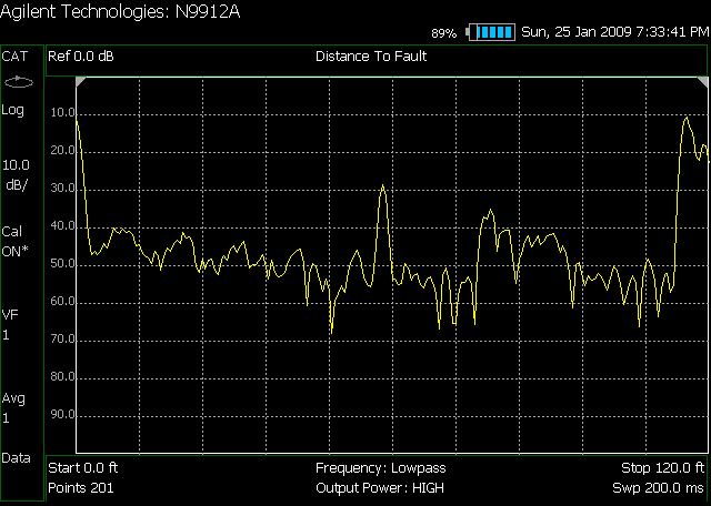 Then I switched to the Cable Tester mode and displayed Distance to Fault (DTF). The DTF display shows the return loss of the cable as a function of the distance along the cable. (The FieldFox analyzer can correct for the propagation velocity but I did not have this feature turned on. So the distance shown is in error by that amount.)