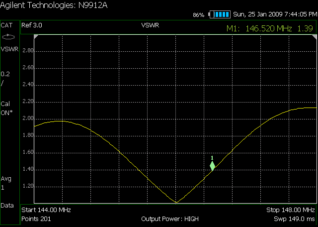Then I checked the VSWR of the antenna system (as seen looking through the end of the cable). The sweep below shows the VSWR of the antenna system versus frequency. The center of screen is 146 MHz and the marker is set at 146.52 MHz. The VSWR doesn’t quite stay under 2.0 over the entire band.