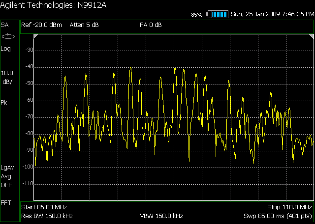 The first thing I did was connect it up to my vertical antenna used for 2 Meters and 70 centimeters. I was able to check a few things on the antenna system and monitor some signals. Funny thing, when I tuned to the 2 Meter ham band, I didn’t see any transmitters on the air <sigh>. So I switched over to the FM broadcast band and did a scan of 86 to 110 MHz. The spectral lines you see sticking up are the FM broadcast transmitters in my area.