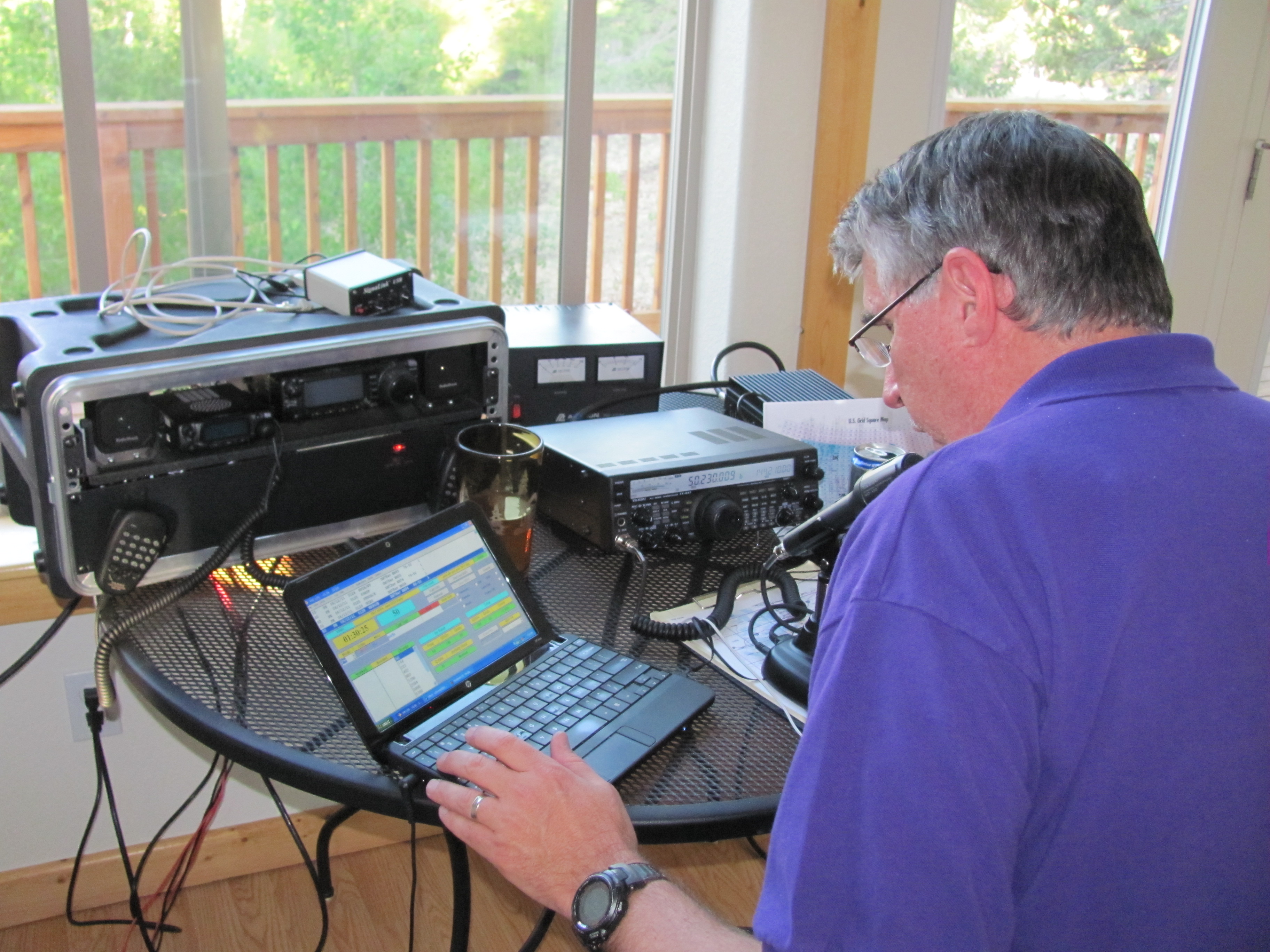 I operated from our cabin up in the mountains, grid locator DM78av. I don’t have a permanent station installation but instead operate in a portable mode. That is to say, I strapped a mast onto the front deck and supported the antennas that way. These two antennas are a really good choice for a portable station…not real small but they can be moved around.