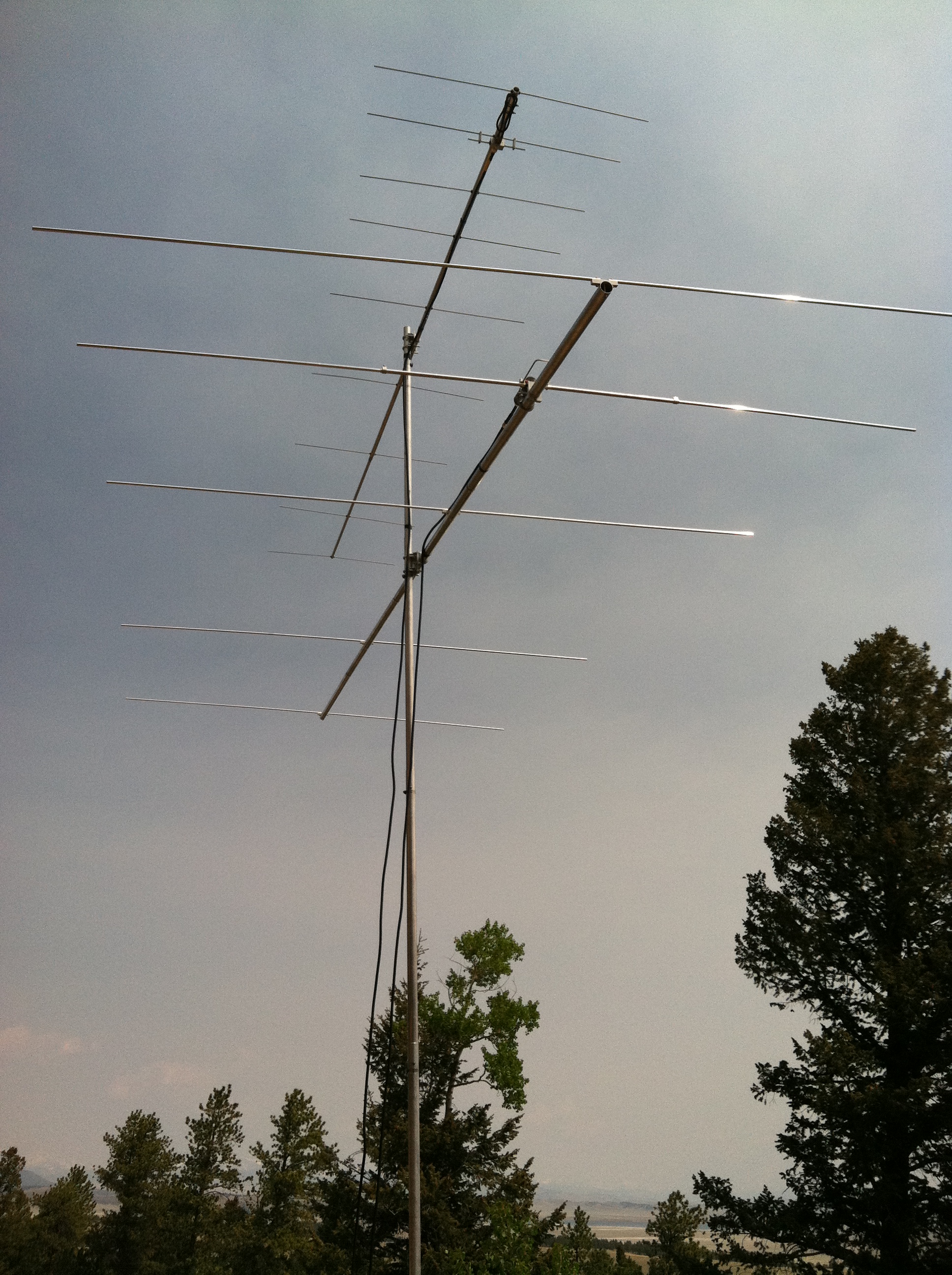 Here’s the antenna array, consisting of a 2M9SSB (12.0 dBd gain, 14.5 foot boom, 9 elements) and the 6M5X (9.4 dBd gain, 18 foot boom, 5 elements):