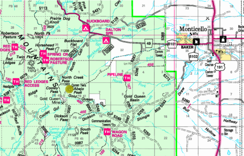 The map below shows the area. The only real challenge was finding B102 heading south/southwest out of Monticello. This later turns into route 0087, which swings south of another SOTA summit: South Peak (W7U/SJ-003) and up over Dickson Pass. (South Peak could be a second summit for a double activation.)