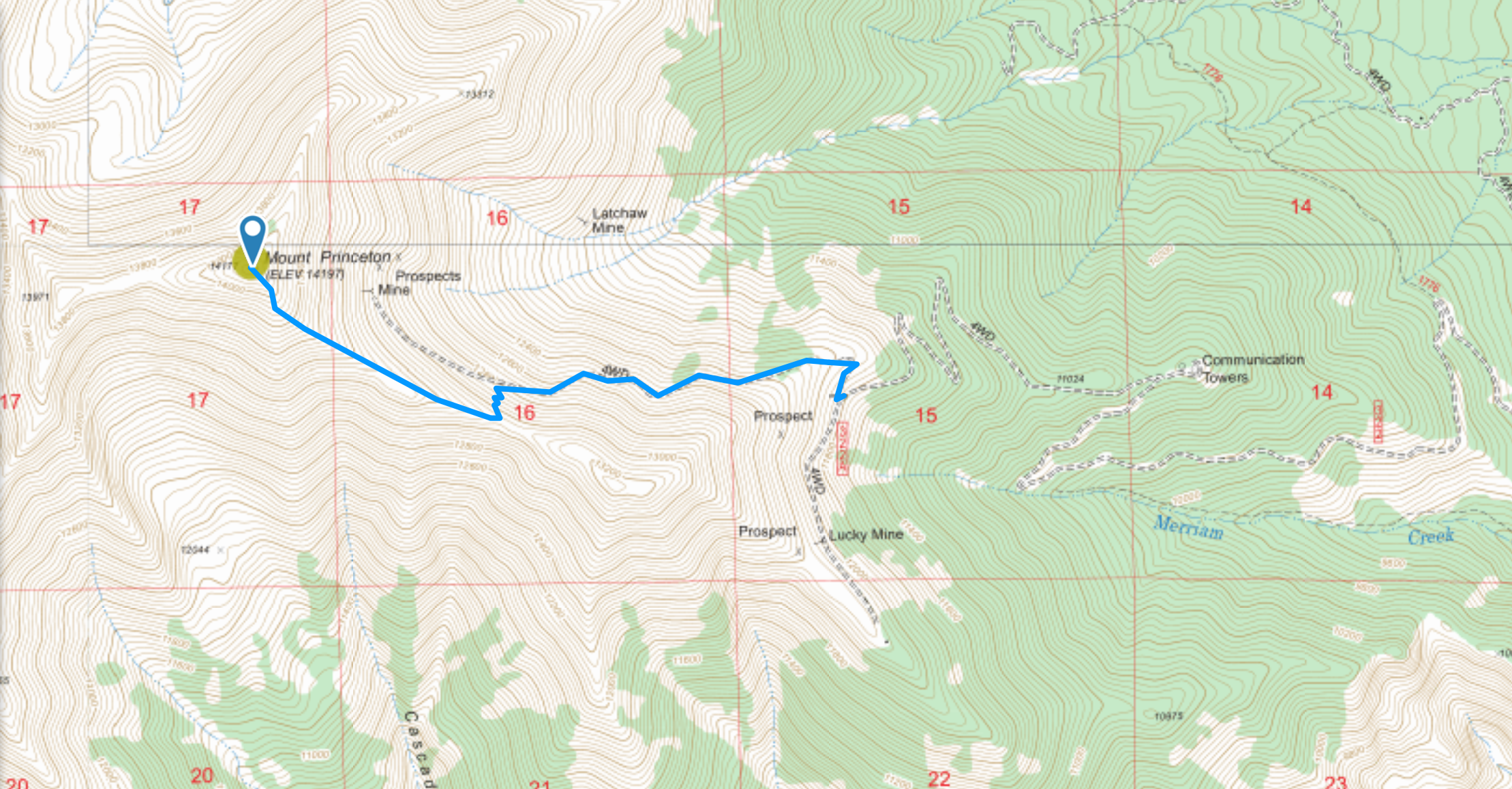 For complete information on climbing this summit, spend some time studying the 14ers.com web site. You will see references to the upper trailhead and the lower trailhead. A 4WD road leads to the upper trailhead which is where we started our hike at 11,800 feet. The lower (or main) trailhead is way down at the bottom (8900 feet) which makes for a much longer hike. Also, you end up hiking on the road, which tends to be boring.