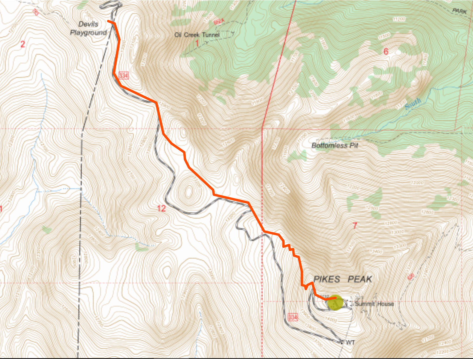 There is a shorter option that does not get much attention (except from some of the locals). The Northwest Slopes route crosses the Pikes Peak Highway at Mile 16 at a popular spot called Devils Playground. There is a large parking area there and the Northwest Slopes trail can be accessed at this point. Just cross the road, step over a cable fence (intended to block vehicles, not people) and follow the obvious trail to the summit.