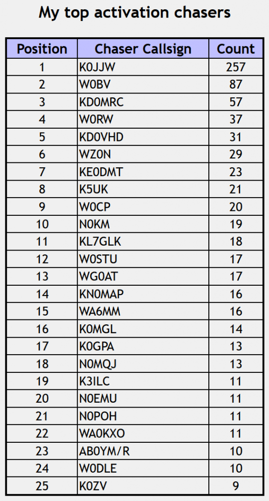 Any SOTA activator will tell you that nothing happens without chasers being there to make radio contacts. Chasers are always important but even more important for VHF due to the limited range. The list below shows my top chasers. Some of these folks are active SOTA enthusiasts but many of them are just friendly folks on the radio helping me achieve this goal. You’ll see that my #1 chaser is Joyce/K0JJW, who usually worked me on multiple bands after leaving the summit.