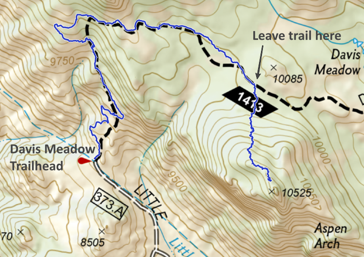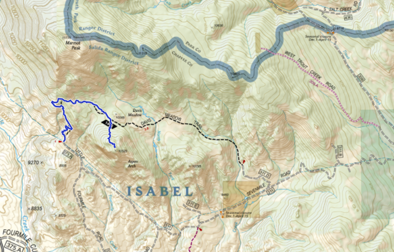 We approached the Davis Meadow Trailhead from the east via Highways 285 / 24. We took FS 311 from Trout Creek Pass to FS 373, then FS 373A. FS 311 starts out in good condition, passable by high clearance 2WD vehicles. Later it turns into “easy 4WD” but it gets very steep in spots which may be a problem during wet weather. You can also approach from the west side coming up from Buena Vista. Check the San Isabel National Forest map for the complete picture.
