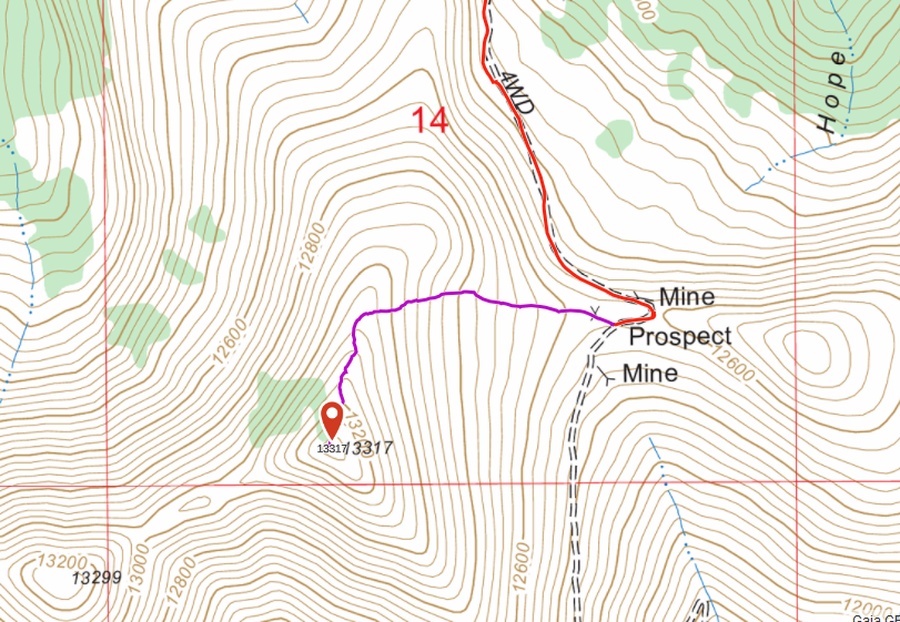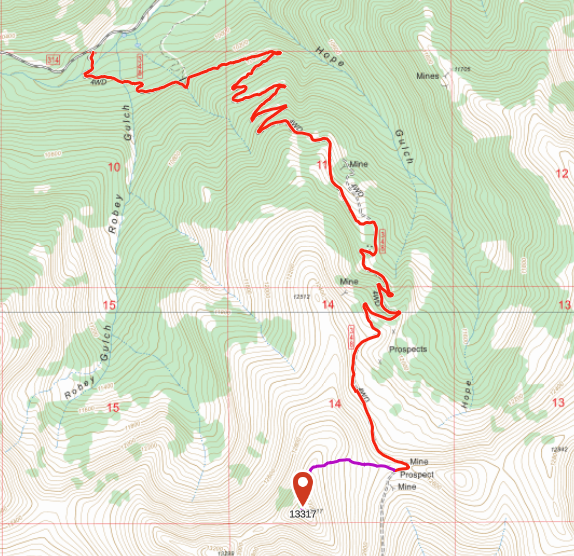 We took County Road 306 west out of Buena Vista, towards Cottonwood Pass. Then we turned left onto County Road 344 which goes to Cottonwood Lake. We continued past Cottonwood Lake until we found FS 348, also known as Hope Gulch Road. We followed this road for 5 miles to the saddle.