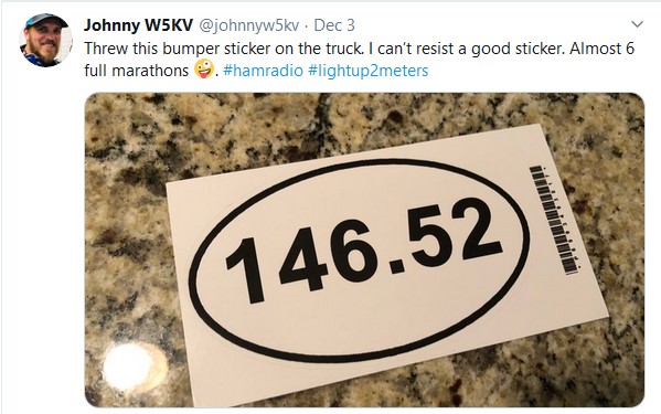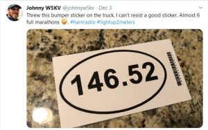 Twitter is such a wonderful source of knowledge and a great place to pick up amateur radio operating tips. I saw this post from Johnny/W5KV, talking about getting a 146.52 sticker for his truck. (146.52 MHz is the 2m National Simplex Calling Frequency.) I’ve written about these stickers here: Get Your Mobile Frequency Sticker On