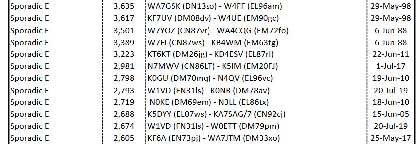 Here’s a snippet from the ARRL list, with my W1VD QSO shown as 2793 km (1735 miles). The W0ETT QSO is also shown on the list as 2674 km (1662 miles).