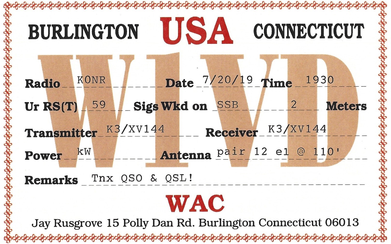 You can see W1VD’s station information on the QSL card above. Obviously, a nice setup. I was using a Yaesu FT-991 driving a Mirage amplifier with 150W output to a 2M9SSB Yagi antenna. My antenna mast is only 25 feet above the ground but I benefit from an excellent radio horizon to the east from 9630 feet in elevation.