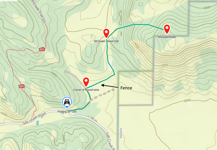 Follow the old road, now a trail, from the parking location. It will curve around to the north and pretty much fade out. At this point, you should see the fence line that runs roughly east/west. Follow this fence line, walking on the south side. At some point, you need to jump the fence. There is a noticeable path on the other side of the fence which indicates where most people crossover. Keep walking along the fence line (on the north side), following the worn path that later turns north. The trail is very established here and easy to follow. Later it fades a bit but you should be able to follow it. Leave the trail somewhere around the marked waypoint (McQuaid – leave trail, 38.96536, -106.00255). Hike off-trail to the summit..it will get steeper and there is downed timber but not too bad.