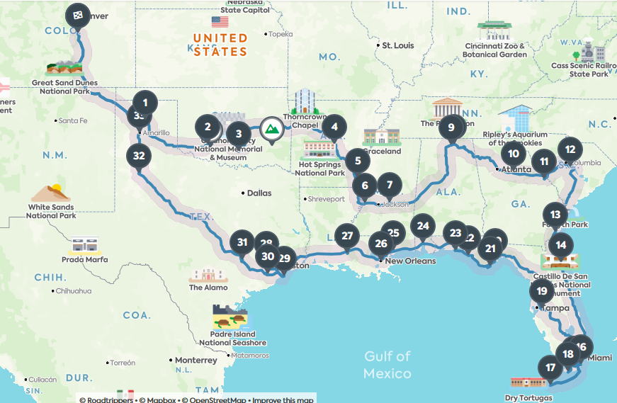 Our main destinations for the trip were four national parks: Congaree NP, Biscayne NP, Everglades NP, and Dry Tortugas NP. This determined the main route but we also found plenty of other things to do along the way. We started in Colorado, cut the corner across New Mexico into Texas, then east through Oklahoma, Arkansas, Mississippi, Alabama, Georgia and South Carolina. Then we headed south to Florida and ended up in Key West. Our return trip followed the gulf coast back to Texas, then back home.