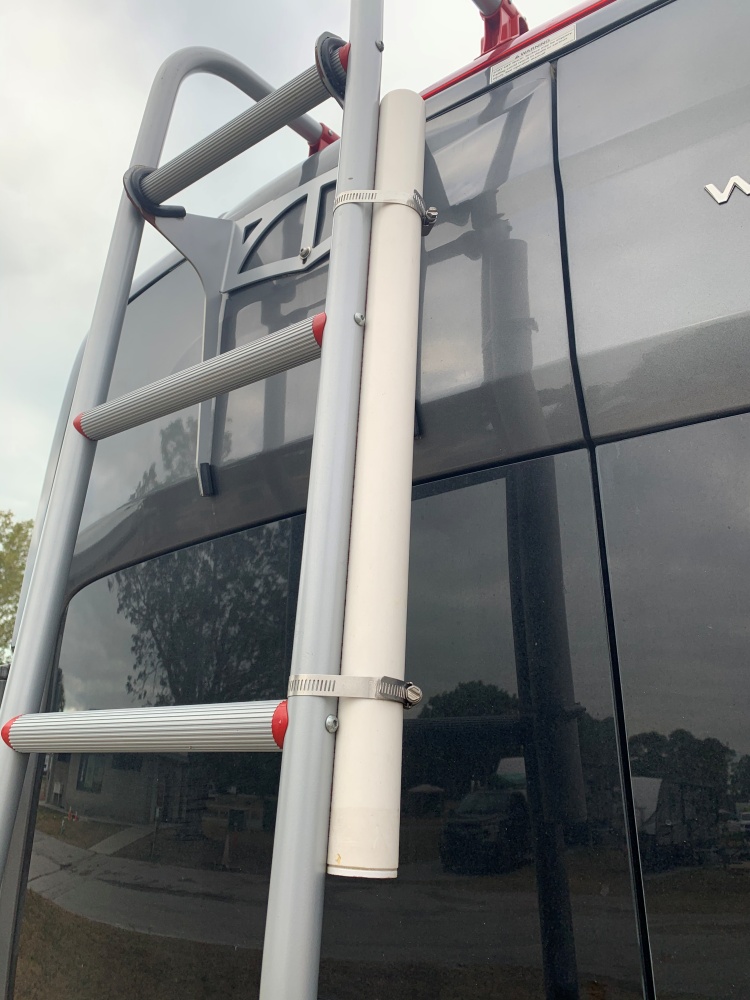 To support the fishing pole directly from the RV, I attached a short length of plastic pipe to the ladder. It is a simple matter to slide the pole into pipe, resulting in the top of the pole being about 26 feet off the ground.