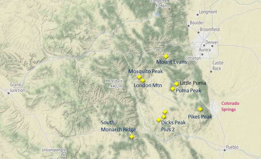 Saturday and Sunday started off with the Colorado 14er Event, so we opted to do Pikes Peak on Saturday and Mount Evans on Sunday. These are both drive-up summits, so not a lot of hiking. As previously reported, we had some good luck with 1.2 GHz from those summits. Then, on Monday we hiked Puma Peak and Little Puma, two 11k summits in South Park. On Tuesday, we did three summits on one day: Dicks Peak, 10090 and 10715. These three hikes were not particularly difficult but doing all three made for a full day.