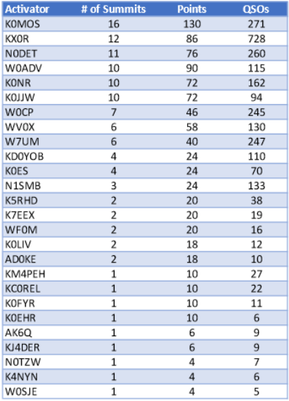 Six activators met the challenge of doing at least 10 summits during the event. That was our goal…not pursuing the top of the list but we did want to get 10 summits done. I am fifth on the list and K0JJW came in at sixth. We had the same number of SOTA points because we did the same summits. I had more QSOs though.