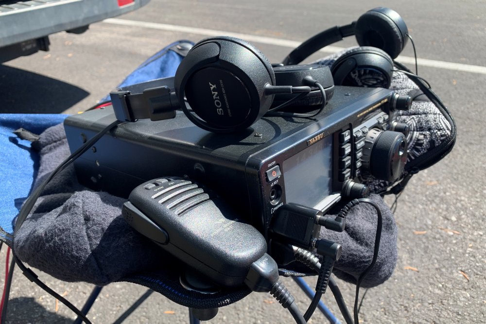 This time we set up in a large parking lot, away from anything that might produce RFI. Again, it was 20m SSB using the halfwave antenna supported by a fishing pole. We sat near the RV on our camp chairs and table. Our typical configuration is to have two sets of headphones so both of us can copy well. We just use the standard handheld microphone which is easily passed between us when we change operators.