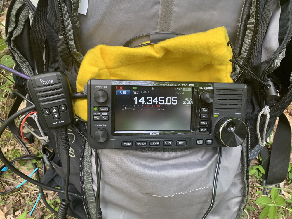 Once on top, we unpacked our recently purchased Icom IC-705 transceiver. This seemed like a good choice for this activation. While we were sure to try good old 2m FM, there was a good chance that we would get skunked on VHF at this rural and not-too-high summit. Sure enough, 2m FM was silent, even using the mighty 3-element Yagi antenna.