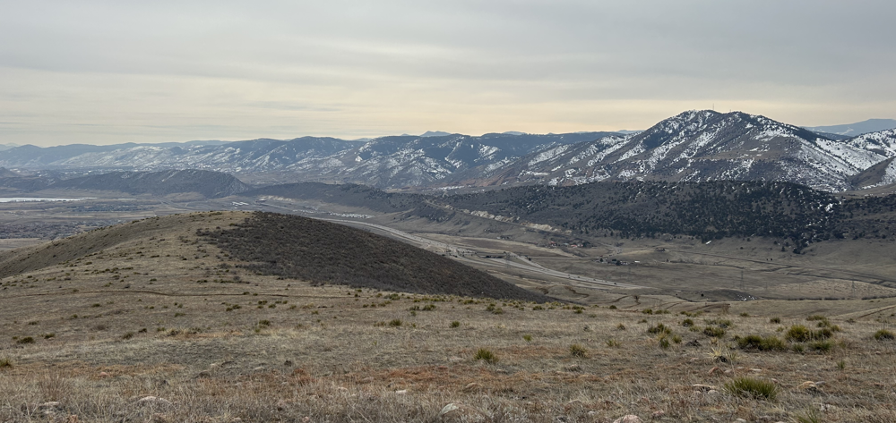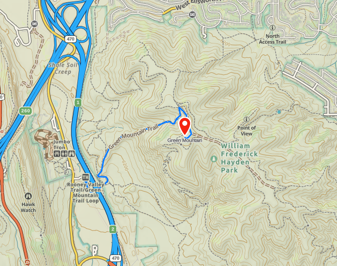 Access is easy and convenient, the trailhead can be found by going west on Alameda Parkway, off C-470, then north on S Rooney Road. There is a large parking lot there and an obvious trailhead with pit toilets. From here we hiked east over C-470 into William Frederick Hayden Park. We followed signs for the Green Mountain Trail, which is basically an unimproved road, to the summit of Green Mountain (see map above). This is not the only option because the park has an extensive trail system to explore. Check out the Lakewood parks map here. Also, you can check the trail conditions here. My mapping app recorded the hike as 1.6 miles (one way) with an elevation gain of 800 feet, not very difficult but still a decent hike. On a cool Saturday afternoon, we met many hikers and mountain bikers on the trail.
