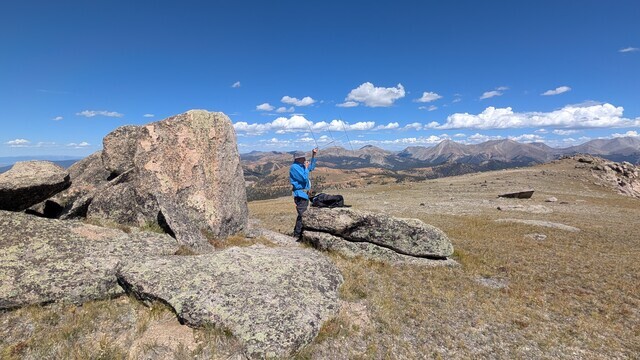 Steve, thanks for doing Mt Peck with me, it was fun! Joyce and I had great fun activating it back in 2017, and it was good to return to it. The summit is near the Continental Divide Trail, accessed from Monarch Pass, so it is an excellent hike on top of the world. The coolest thing about this summit is the nice rock that served as a gear table (see Steve’s photo above.) No bending down to pick up my backpack or equipment.