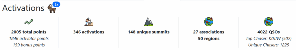 Here are some fun facts I have from reviewing my log. Currently, I have 2005 activation points. If you ask the SOTAdatabase for my 2m log, it also shows 2005 activation points. This is not quite right in my view, because it counts all activations with points that have at least one 2m contact included. That is, not all activations had four 2m or VHF contacts. In reality, I have 9 activations (corresponding to 41 points) that used HF to get the required four QSOs (for points). This means I need 36 more 2m-only points to get a pure 2x VHF Mountain Goat, untainted by HF QSOs. 🙂