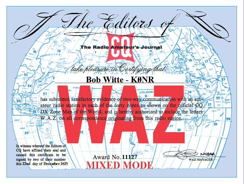 Nicely done Bob. And I agree, WAZ is much harder than DXCC. I was past 200 entities (20m, phone on a 100W dipole) before finishing it, and the last 2–Thailand and Egypt–took years. DXCC is really more fun as the countries fall fast, and conceivably could largely be finished in a contest weekend with good conditions. But I’ve found that once you get beyond around 250 entities it becomes more similar to WAZ as you have to start digging out those rarer and more remote ones. I’m glad the award continued after CQ folded, though wish the prefix awards had too. Anyway, for a new challenge there’s the Triple Play DXCC, which could be interesting. You sound set up for it.