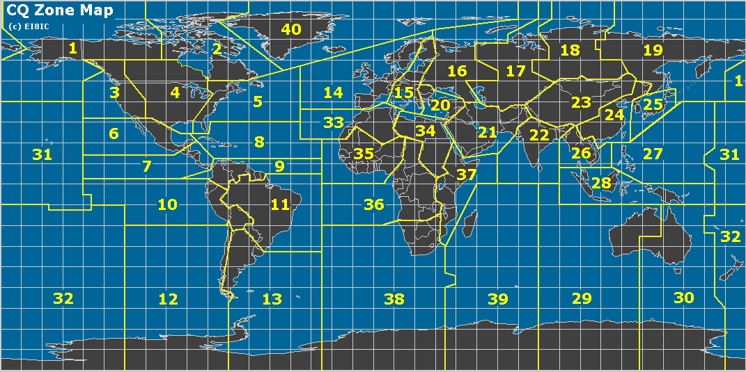 The Worked All Zones (WAZ) award is another well-known HF DX award, organized by geography. WAZ recognizes operators for establishing confirmed two-way radio contacts with stations in all 40 geographic zones defined by CQ’s official zone map. These zones divide the world into areas based on continents, regions, and specific entities (see the map below). See the WAZ rules here.