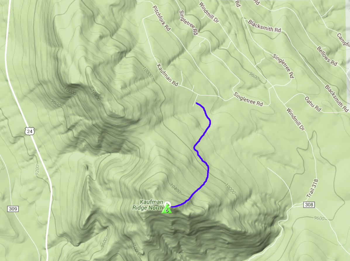 My blog posting about the next mountain to the south, Kaufman Ridge HP (W0C/SP-081), outlines a good way to access both summits during the summer. However, a seasonal gate closure (December 1 to April 15) means we needed to find a different route. We approached the mountain from the north, parking our vehicle on Castle Court (a short side road off of Kaufman Road). We hiked an old ranch road that quickly crossed what appears to be private property (empty lot, no signs) to get to the US Forest Service boundary. Once we hopped the fence we were on public lands. We intentionally routed to the east to avoid some houses.